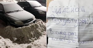 Житель Электростали оказался добрее: он всего лишь забросал машину снегом (и то не полностью) и оставил записку: «Удачной физкультуры!!! В следующий раз полностью закопаю».