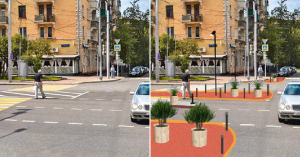Что предлагается сделать? В первую очередь обезопасить пешеходные переходы и перепроектировать перекрестки: сузить полосы, правильно подсветить зебры, часть дороги забрать под островки безопасности. На них можно расставить кашпо с растениями (ну, чтобы уж точно никто не заехал, а пешеходам было приятнее). Везде, где больше двух полос, предлагается поставить светофоры.