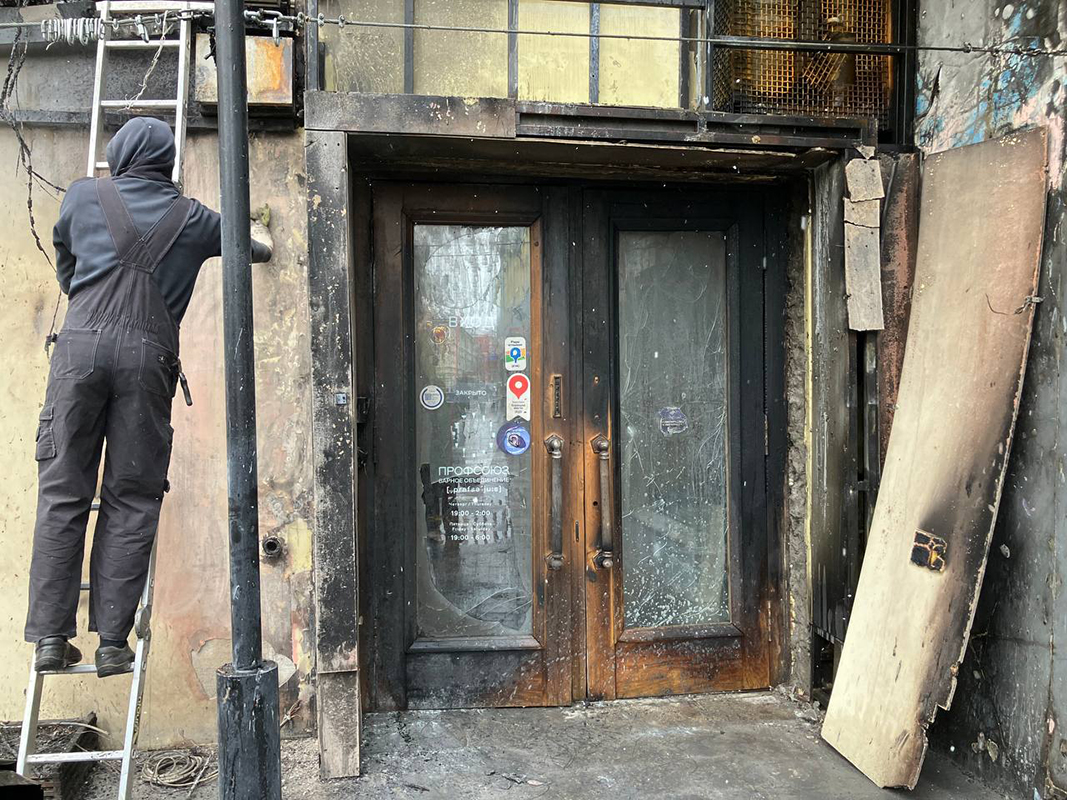 Видео с полыхающим входом в «Профсоюз» первым опубликовал телеграм-канал «Антиглянец».