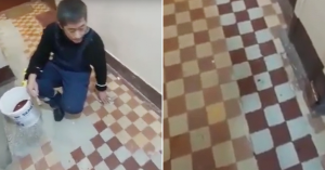 Видео, которое сняла одна из жительниц подъезда, стало зарисовкой на тему смекалочки сотрудников коммунальных служб: вместо того чтобы класть на место сбитой плитки в подъезде новую, ее решили просто нарисовать. Удобно, особенно если краска, которой обычно покрывают забор, так подходит по цвету.