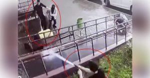 Первыми, судя по видео, напали сами коммунальщики — один схватил парня за шею и перекинул через перила, правда, тот быстро встал и дал сдачи. Позже подключился мужчина со шлангом, и сразу преимущество перешло на сторону хулиганов.