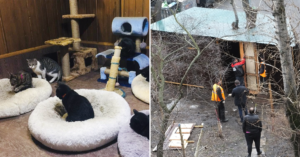 В домике поселилось более десяти животных — они жили в тепле, спали на мягких подушках, игрались, временами ловили крыс. Сам мужчина, который построил дом, лечил и кормил кошек на свои деньги, покупал ошейники против блох, делал прививки. Соседи тоже, конечно, подкармливали.
