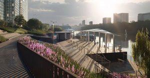 На набережной также появятся павильоны с кафе, пунктами проката и зонами отдыха. А напротив одного из ЖК организуют причал, к которому будет вести парадная лестница.