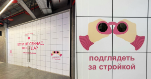 В «Европолисе» бренд Macrocosm сделал дырки в баннере, чтобы посетители подглядывали за стройкой