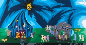 «Яркие краски, в которых играют глазки, гротеск и очаровательно наивные истории, вырабатывающие гормон счастья. Буйно-красочный мир “Нашей Утопии” приглашает в круговорот своего бытия!» — говорит Перкин.