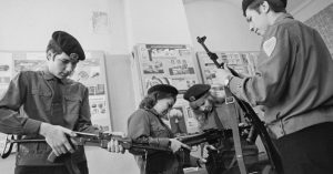 Начальная военная подготовка появилась в советских школах в 1967 году и была отменена в 1990 году, а часть ее программы включили в занятия по ОБЖ. Как можно понять из названия, старшеклассников обучали основам военной службы: строевому шагу, сборке и разборке автомата Калашникова, ориентированию на местности, оказанию первой медицинской помощи. Нужно было знать, как устроена ручная граната, как надевать ОЗК и даже зубрить список обязанностей дневального по роте.
