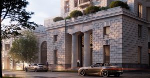 В каком-то смысле новостройка будет выглядеть даже более исторической, чем ее соседи, поскольку построят ее в стиле, напоминающем неоклассицизм на стыке с минимализмом. Крыльцо у входа будут держать две массивные колонны, небольшую террасу огородят балюстрадой, а фасады украсят горельефами со львами и узорными барельефами.