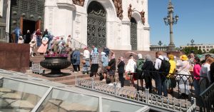 Верующие москвичи стоят в длинной очереди в Храм Христа Спасителя, чтобы поклониться Тихвинской иконе Божией Матери. Очереди у главного московского храма выстраиваются почти по каждому значимому для православия поводу. В смысле безопасности на этот раз решили ограничиться ограждениями и металлодетекторами, без такого количества правоохранителей, как было на Пасху.