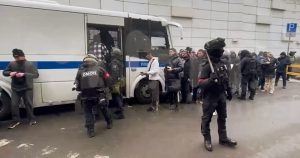 Как можно понять по видео, нарушителей выстраивают в шеренги и после проверки документов распределяют по автозакам. Часть увозят в миграционный центр временного содержания, часть — в военкомат. Все это происходит на внутренней территории ТЦ «Савеловский», прямо возле торговых павильонов.