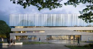 Судя по показанной визуализации, представлять собой академия хоккея Александра Овечкина будет довольно невысокое (примерно пять этажей) здание серого цвета в стеклянной шапке на двух верхних этажах. Бетонную часть фасада попытались разнообразить, разделив посередине косыми линиями разных оттенков, из-за чего создается иллюзия, будто весь фасад наклонен. Кроме того, заметно, что на третьем этаже сделают террасу, на которой разместят то ли зону отдыха с зонтами, то ли кафе.