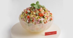В кондитерской «Любовь и сладости» создали новогодний торт в виде салата оливье