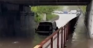 На кадрах видно, как несчастный водитель эвакуируется из машины, хватая все самое ценное. Да, он по пояс стоит в воде, но под мостом хотя бы дождь не хлещет в лицо — уже хорошо. А машину, возможно, теперь придется доставать с помощью спецтехники, ну или ждать, пока станет мелко.