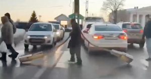 В соцсетях опубликовали видео, на котором мужчина переходит дорогу, держа на плечах верхушку огромного уличного фонаря.