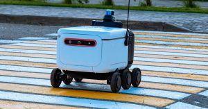 Москвичка сняла, как электронный доставщик переходит дорогу на красный сигнал светофора.