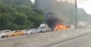 Источник телеканала «360» в экстренных службах рассказал подробнее об обстоятельствах происшествия: «Газель “Соболь” стояла на аварийке, к ней подъехала Mazda помочь, и в них влетело такси, в котором были два человека — водитель и пассажир. Они успели выйти, и машина загорелась».