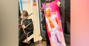В метро заметили парня с гигантской розовой подушкой с Райаном Гослингом