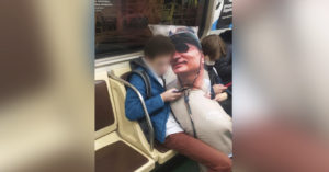 Ни пассажиров, ни самого героя сюжета нисколько не смущает происходящее: он спокойно читает что-то в телефоне, одной рукой (и одной ногой) обняв Путина.