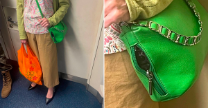 Стоит отметить, что шпионка из пассажирки так себе: она слишком ярко одета. На ней были кардиган цвета лайма, цветастая блузка, штаны песочного цвета, а завершали образ оранжевая авоська и — главный атрибут — зеленая сумочка с камерой. Слиться с толпой у нее в таком виде явно не получится.