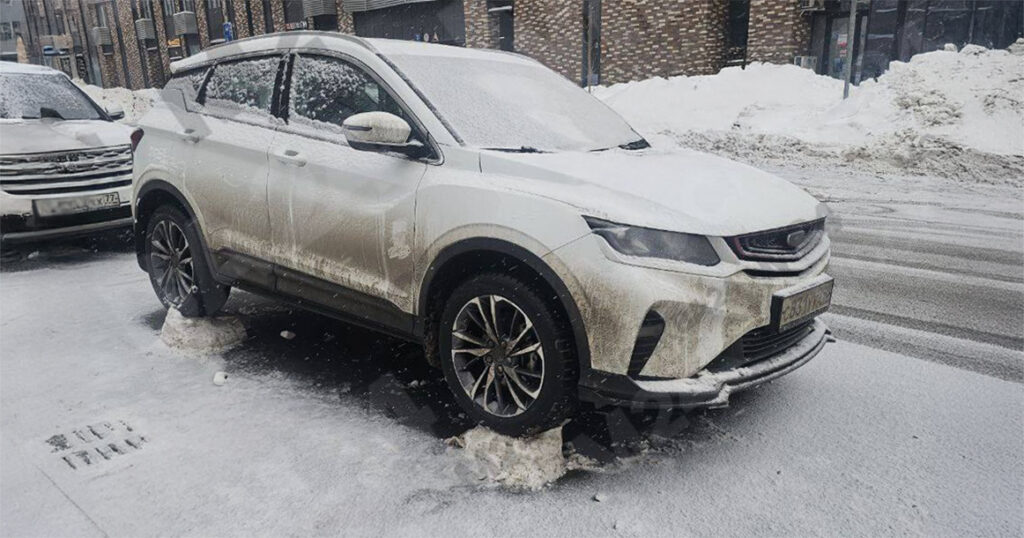 На снимке видно белый кроссовер, припорошенный снегом, а под ним — идеальная чистота. Машина стоит на аккуратных ледяных «пьедесталах», как экспонат. Вокруг нет ни привычной снежной каши, ни даже следов от лопаты.