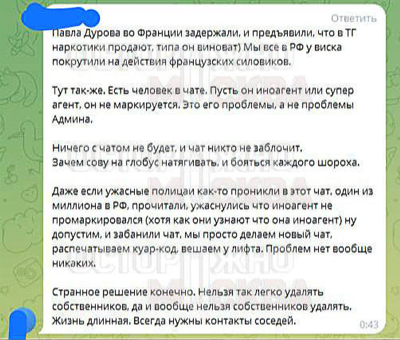 Как пишет «Осторожно, Москва», все началось с обычной просьбы: женщина попросила соседей не включать перфоратор с семи утра, чтобы дать людям поспать. Но хозяевам шумной квартиры это не понравилось. В чате вспыхнул спор, подробности которого не приводятся. А через несколько дней жительница обнаружила, что ее просто исключили из переписки. Когда женщина спросила, почему, администратор ответил: дело в статусе иноагента.