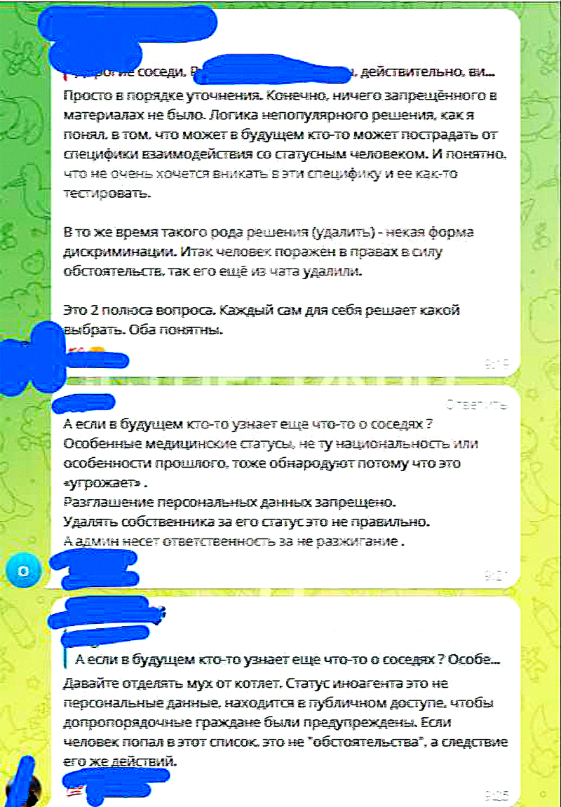 В одном из жилых комплексов на севере Москвы произошла типичная, казалось бы, история: соседей поссорил ремонт. Но завершилась она не жалобой в управляющую компанию, а удалением одной из жительниц из домового чата. Причина не только в споре, но и в ее статусе иноагента.