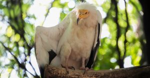 Кстати, хотя птицы и относятся к одному виду, выглядят они совершенно по-разному. Цвет оперения, как говорят в зоопарке, зависит от возраста: у молодого стервятника окрас темный, а у взрослой птицы — светлый, почти белый, с серо-коричневыми вкраплениями.