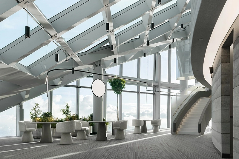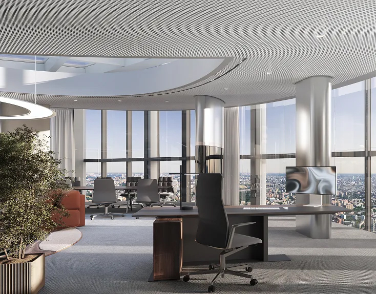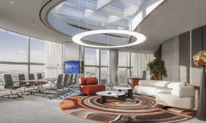 На первом уровне «лобби с рецепцией, гибкие рабочие места для операционных сотрудников, переговорные, комнаты тишины, лаунж-пространства, кафе, библиотека (!) и апартамент для проживания гостей» (!!). Второй уровень — помещения для топ-менеджеров, секретарей и переговорные. Третий — VIP-кабинеты для первых лиц.