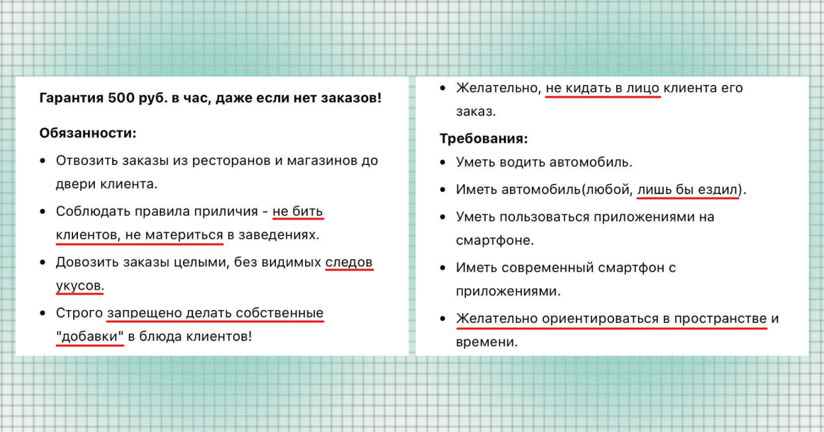 Но дальше в списке обязанностей начинаются уточнения, которые редко попадают в обычные объявления. Курьеру предлагают соблюдать правила приличия — «не бить клиентов» и «не материться в заведениях». Заказы нужно довозить целыми и без «видимых следов укусов», а также строго запрещается делать собственные «добавки» в блюда. Есть и отдельная просьба: по возможности не кидать заказ в лицо.