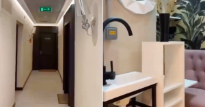 Автор завирусившегося видео приводит в пример крошечные апартаменты, площадь которых составляет всего 2,3 кв. м. Из удобств там есть диван, тумба, настенная полка, зеркало и даже раковина, однако санузел общий и располагается в холле ЖК.