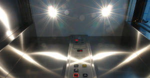 Работает так: дезинфектор синхронизирован с другими системами автоматического подъемника (например с датчиками присутствия), так что включается только в момент, когда в кабине никого нет. При открытии дверей система тут же останавливается. При этом в кабине разместили экран, на котором показываются параметры работоспособности излучателя. За час он, по планам, должен уничтожать до 98% болезнетворных микроорганизмов. Пока испытания это подтверждают.