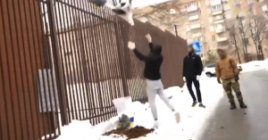 Несколько видео опубликовал телеграм-канал Mash. На них видно, как организованная группа людей в масках проводит свои загадочные перформансы, перекидывая мешки через заборы посольства. На мешках украинский флаг.
