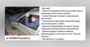 Погружаться в «романтику нищеты» предлагали в Бескудниковском районе Москвы. В пакет входил набор сомнительных мероприятий: «распитие дешевых алкогольных напитков», «круиз по Подмосковью на самых гнилых, чаще всего отечественных, автомобилях», дрифт на парковках ТЦ, «разборки с иностранцами» (за дополнительную плату), «спортивный бег от сотрудников правопорядка» (тоже отдельно) и другие «радости».
