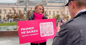 На улицы столицы вышли девушки с розовыми плакатами, на которых изображен QR-код, отсылающий к памятке по самообследованию груди на сайте департамента здравоохранения Москвы, а также фразы «Размер не важен», «Трогай и проверяй».