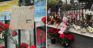У посольства Палестины в Кропоткинском переулке собрались люди, выражающие поддержку жителям Газы. Собравшиеся несли флаги Палестины, плакаты, призывающие к миру и прекращению боевых действий, цветы и игрушки.