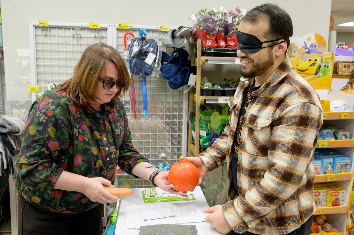 Для персонала магазина провели тренинг и объяснили, как корректно предложить помощь незрячему человеку, как сопровождать по залу, не нарушая личные границы, и как вести себя, если покупатель приходит с собакой-проводником. Чтобы лучше понять опыт незрячих людей, работникам магазина предложили самим пройти небольшой интерактив: с повязкой на глазах ориентироваться в пространстве и определять товары на ощупь.