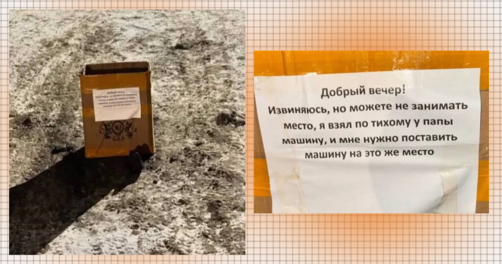 «Добрый вечер! Извиняюсь, но можете не занимать место, я взял по тихому у папы машину, и мне нужно поставить машину на это же место», — говорится в объявлении, приклеенном к коробке скотчем.