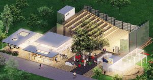 «Летний “Пионер” в Музеоне создан российским архитектурным бюро А4 на месте кинотеатра, построенного в постсоветское время. В новом кинотеатре появились полноценный бар “Пион” с лаунж-зоной, лекторий, пространство для занятий антигравити-йогой и проведения выставок, а также детская площадка», — рассказывают организаторы.