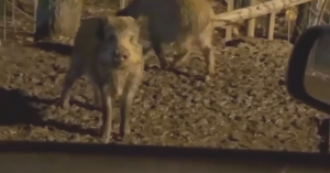 В Мытищах дикие кабаны окружили водителя в машине