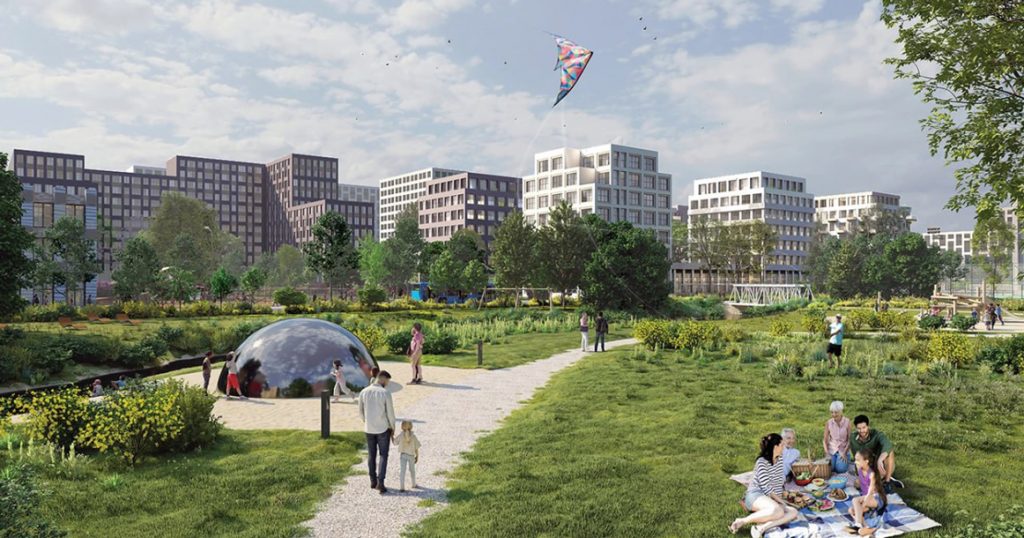 Часть возле мусоросжигательного завода, как видно на рендерах, будет относительно малоэтажной (кварталы 18, 21–24). А возле реки Пехорки архитекторы запроектировали парк с зеркальными арт-объектами в виде полусфер.