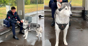 Дело было в Ново-Переделкино недалеко от местного парка. Как рассказывают в дептрансе, контролер Виктор заметил одинокого потерявшегося хаски на остановке — у собаки был поводок, а хозяйки рядом не наблюдалось.