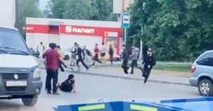 На кадрах видно, как приезжие избивают друг друга во дворе и кричат. При этом один, предположительно, даже ухитрился попасть под машину — на видео он лежит на дороге (находясь в сознании и наблюдая за происходящим), а рядом с ним стоят двое мужчин (вероятно, один из них — водитель грузовика, стоящего на дороге).