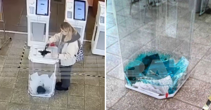 UPD: Shot пишет, что девушку, которая залила в урну зеленку, зовут Алина Н. Ее несколько дней назад якобы развели мошенники — украли крупную сумму денег, но пообещали вернуть средства за исполнение «секретной миссии». На допросе девушка заявила, что ее заставили пойти на этот шаг украинские спецслужбы.