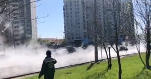 С верхних этажей окрестных домов картина выглядит особенно эпично и довольно инфернально: улица оказалась буквально залита кипятком, над проезжей частью высоко поднимается пар. Автомобили на проезжей части замедляют движение перед местом происшествия, и все равно вокруг их колес вздымаются буруны горячей воды.