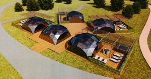 На информационном щите указано, что работы завершатся уже в марте. Сам банный комплекс будет состоять из пяти корпусов с верандами, купелями и ресепшеном. На визуализации выглядит все это как полевой лагерь со стеклянными юртами, вокруг которых обустроены зоны отдыха с лежаками. Судя по документации, опубликованной на сайте мэрии, внутри будет интерьер «как из Пинтереста» — обтекаемые формы, терракотовые стены, большие светильники.