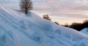Снежные рулоны — явление довольно редкое. Чтобы они появились, должно быть стечение определенных обстоятельств: сильный ветер (но не слишком, чтобы не разрушить), а еще влажный, но одновременно рыхлый снег и температура около нуля. Тогда под силой ветра на склоне образуются такие завитки.