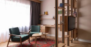 Все они были реконструированы в стиле ранних 1970-х и имеют балконы, выходящие в лес, и полки с коллекцией книг одного из писателей, трудившихся в Переделкино. Советский антураж выдержан не только в номерах, но и в интерьерах всей гостиницы — отделка стен камнем «под известняк», мебель округлых форм и неярких цветов, живые цветы да витражи.
