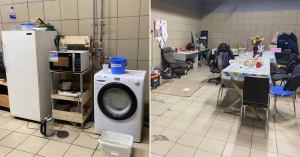 Кроме того, по приложенным фото видно, что условия в «хостелах» действительно жуткие. Хотя их и попытались оборудовать всем необходимым и даже придать подвалу уют (например, на обеденных столах постелили яркие скатерти и поставили вазу с искусственными цветами), при этом раздевалка и сушилка для обуви находятся прямо рядом с обеденными столами. Кроме того, удлинители перегружены бытовой техникой и находятся рядом с ведром с водой, так что есть риск короткого замыкания.