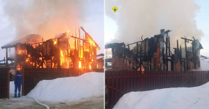 На фотографиях видно, что пожар начался ближе к утру. Сам дом деревянный — у него обвалилась крыша, сгорели стены. Огонь тушили силами 6 пожарных машин и 30 спасателей. После локализации пожара спасатели отправились разбирать завалы. Очевидцы говорят, что семья даже не успела проснуться, чтобы спастись из огня.