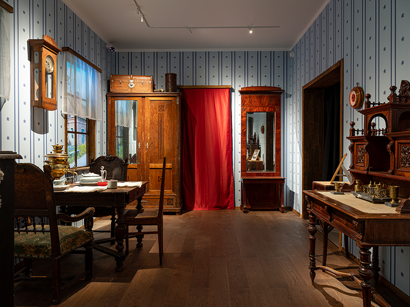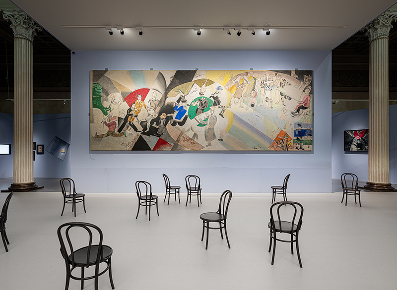 Авторы проекта воссоздали зрительный зал Еврейского камерного театра, для которого в 1920 году Шагал расписал девять панно, олицетворяющих важную веху в истории русского авангарда. Среду, в которой когда-то жил и творил художник, передает инсталляция «Комната семьи Шагал» с мебелью из дома живописца в Витебске.