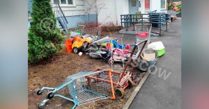 Только мало кто этим рекомендациям следует. А в Пыхтино коммунальщикам, видимо, так надоело бороться с собственниками, что они пошли на радикальные меры. В итоге выкинутыми оказались игрушки, снегокаты, коляски и самокаты — их хаотично сложили на газоне возле дома.